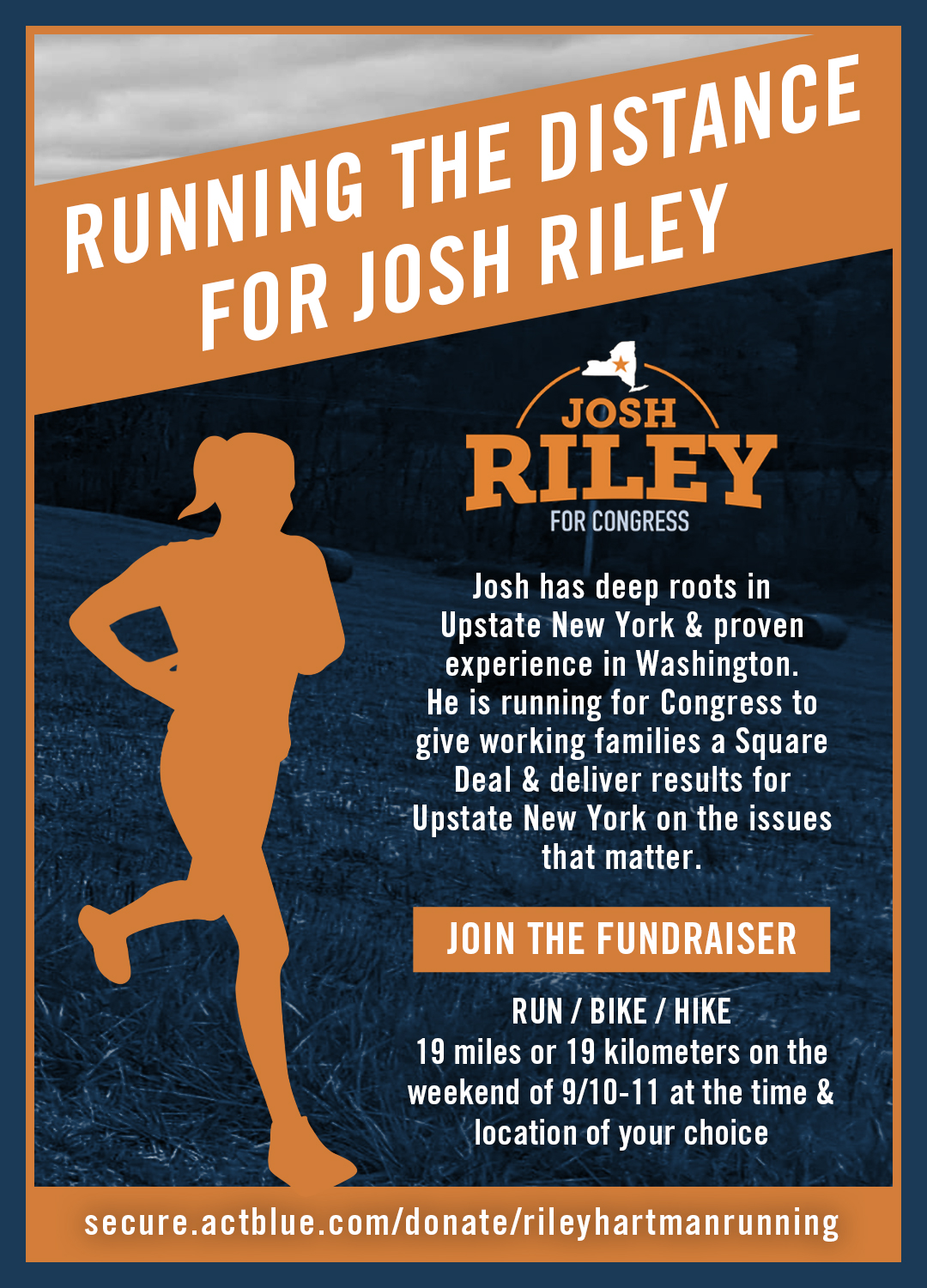 Join Democrat Josh Riley supporters from all over New York Congressional District 19 to help him win the November 8, 2022 election. How does it work? Anyone who is interested can participate by donating through the ActBlue link below and/or running, hiking or biking 19 miles or kilometers the weekend of September 10th/11th at the time and location of their choice.