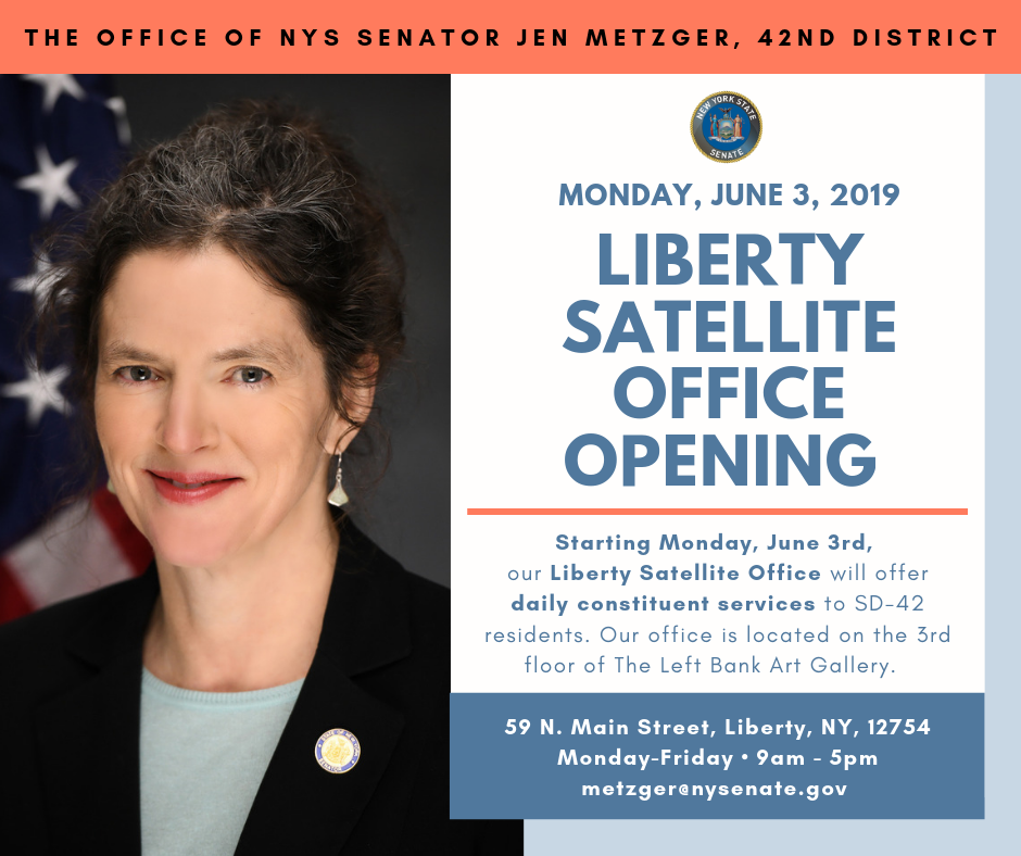 Senator Metzger – I am happy to announce that our #Liberty Satellite Office will open on Monday, June 3rd! My staff and I are very excited to have a full-time presence that will allow us to better serve constituents in and around#SullivanCounty.