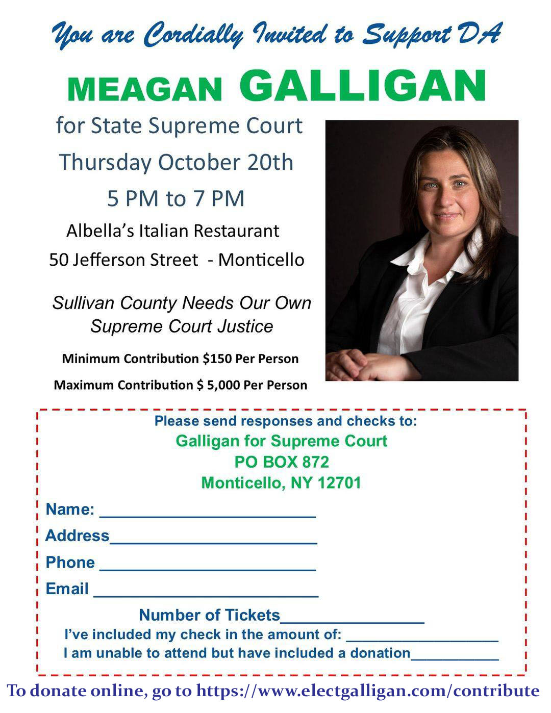 Join the friends of Meagan Galligan for Supreme Court on Thursday, October 20th from 5 - 7  pm at Albella's Restaurant. Tickets are $150.00 and payment can be mailed to Galligan for Supreme Court PO Box 872 Monticello, NY 12701 If you're unable to attend but would like to donate to the campaign, click here… Read More »