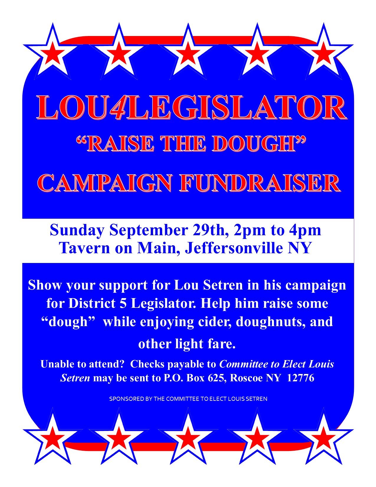 Show your support for Lou Setren in his campaign for County District 5 Legislator. Help him raise some campaign “dough” while enjoying cider, doughnuts and other light fare. Unable to… Read More »